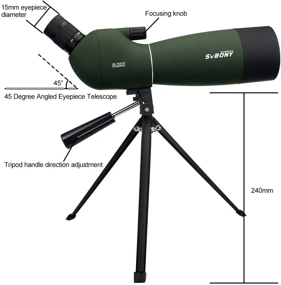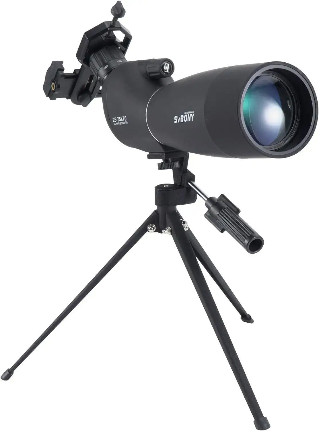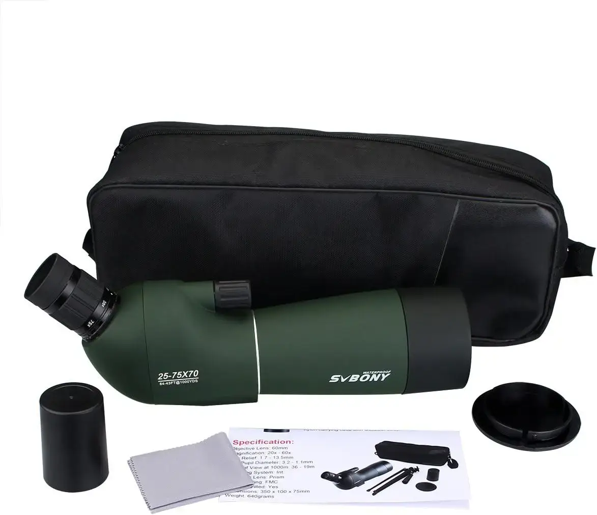 Pacchetto: Svbony 25-75×70 Spotting Scope, Adattatore per cellulare, Custodia, Coperture, Panno per la pulizia, Treppiede, Manuale utente