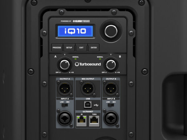La serie IQ di Turbosound è equipaggiata con amplificatori a due canali in classe D di Klark Teknik, molto efficienti e leggeri. Il controllo e la gestione del sistema di altoparlanti è effettuato da un sofisticato ma facile da usare processore di segnale digitale. Sul retro degli altoparlanti IQ è il cuore della serie IQ, il modulo amplificatore. Le numerose interfacce sul pannello posteriore offrono un’ampia varietà di connessioni. Il display LCD, i controlli di guadagno e l’encoder per l’accesso intuitivo ad es. al controllo di livello, EQ e feedback sono solo alcune delle utili caratteristiche della serie IQ.
