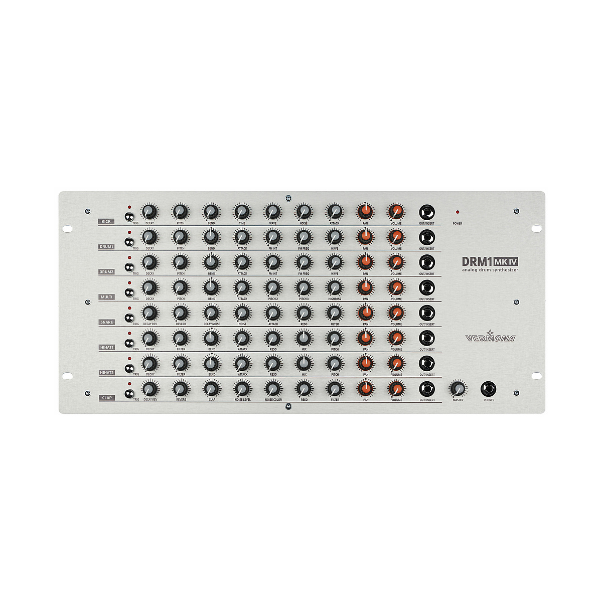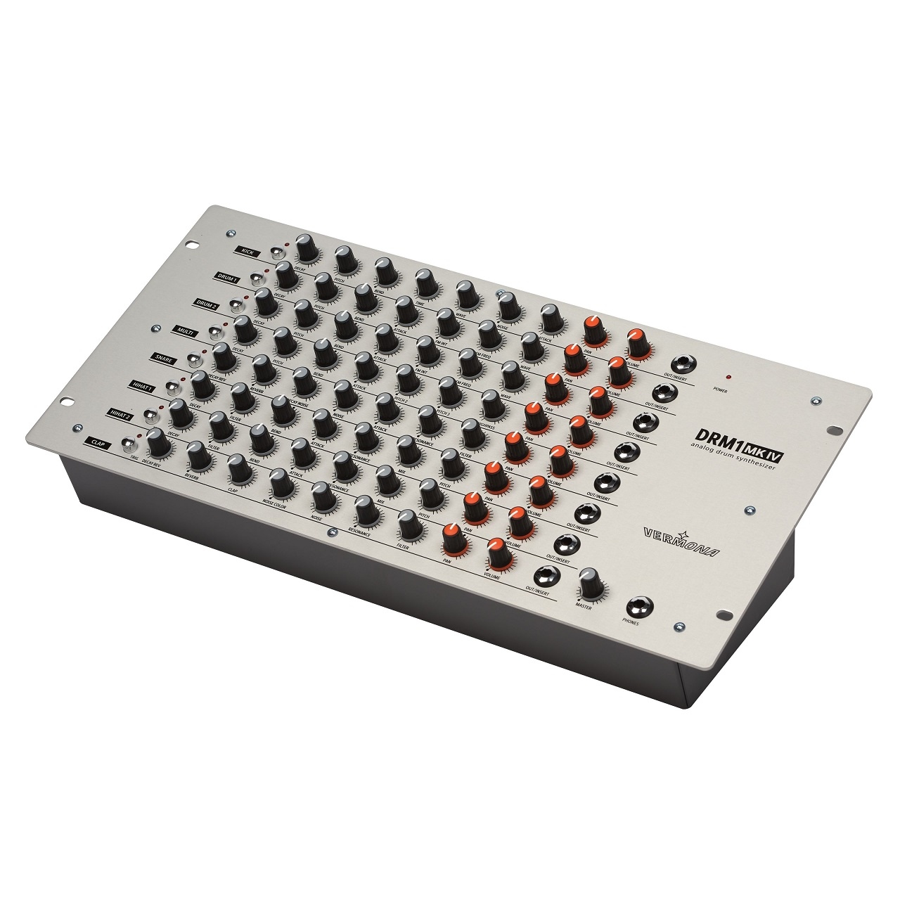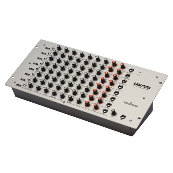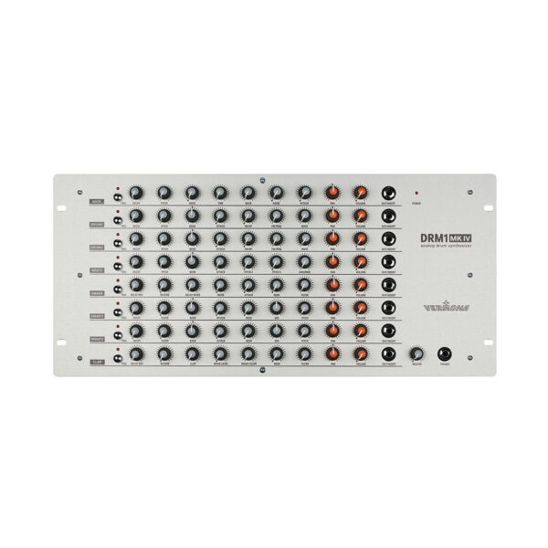 DRM1 MkIV di Vermona è ora disponibile nella sua quarta generazione e con un totale di oltre 20 anni di presenza sul mercato può sicuramente essere considerato un classico eterno. La superficie coperta da 73 manopole lascia molto spazio per l’avvitamento dell’unità rack 19″ / 5 HU pronta per il desktop. Sette parametri, oltre a Level e panorama, sono regolabili per canale. In totale, il DRM1 ha otto canali e voci ciascuno, ma più di 10 strumenti, grazie ai due canali hi-hat, che possono essere suonati alternativamente come Cymbal. Le otto uscite individuali possono essere utilizzate come insert; il segnale elaborato viene quindi inviato all’uscita stereo. Tutte le connessioni, comprese quelle USB e il trio MIDI, sono sfalsate sul retro, in modo da non dover sacrificare ulteriori unità di altezza per i cavi durante l’installazione in un rack.