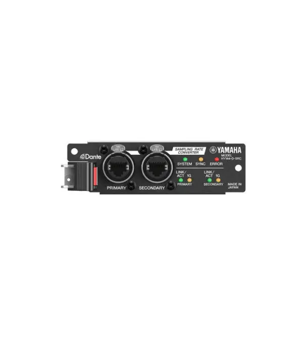 La scheda di interfaccia audio Yamaha HY144-D-SRC supporta il protocollo di rete audio Dante, gestendo fino a 144 canali di ingresso e 144 canali di uscita di audio digitale a 96 kHz/32 bit.
