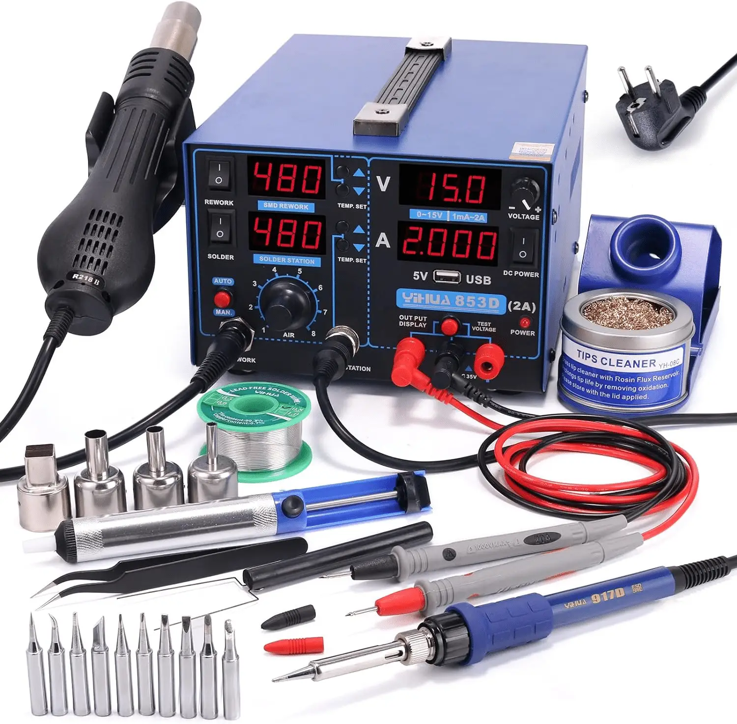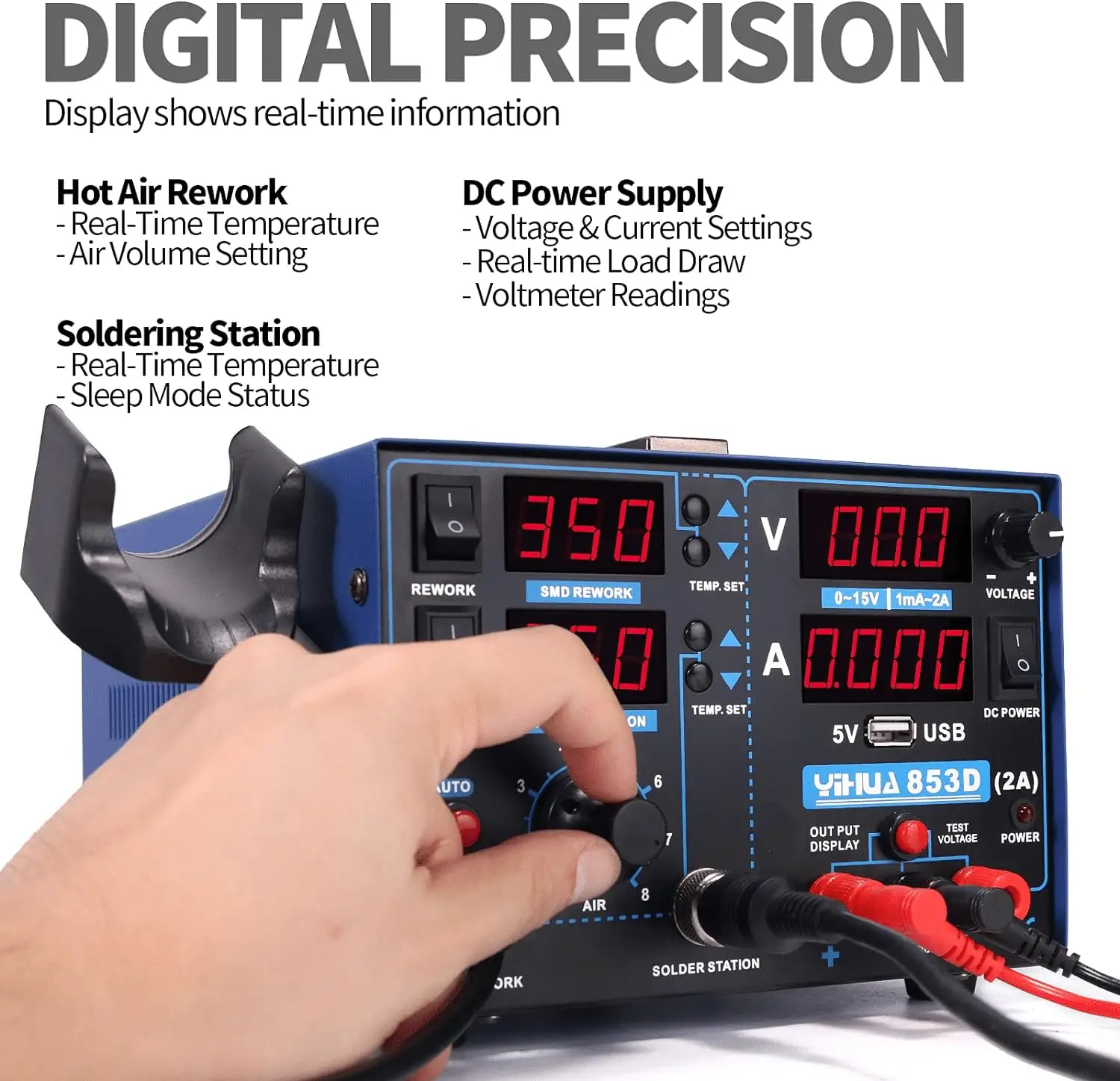 YIHUA 853D 2A USB Stazione Saldante Ad Aria Alimentatore 0-15V DC